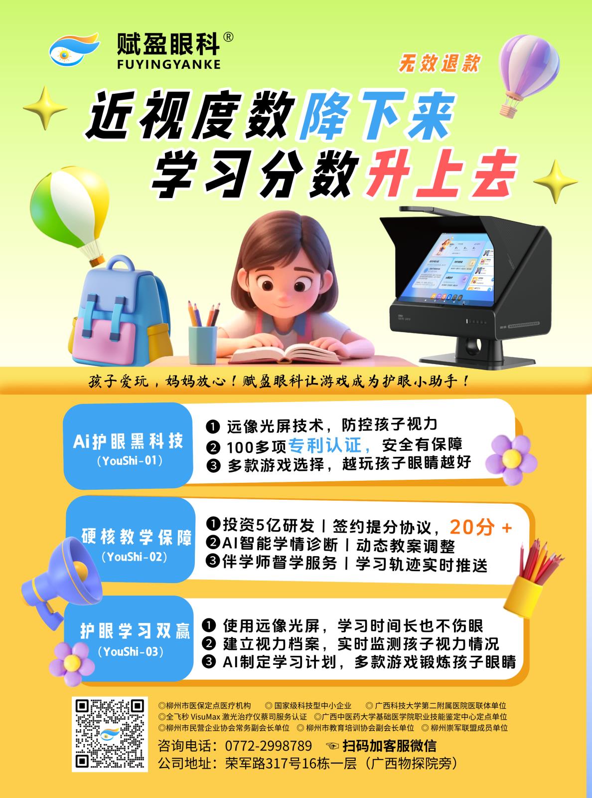 赋盈眼科新产品上线了!AI护眼+学习黑科技让孩子的近视防控更加科学,保护好每一位孩子的眼睛。远像光屏利用智能拉远科技,仿生户…